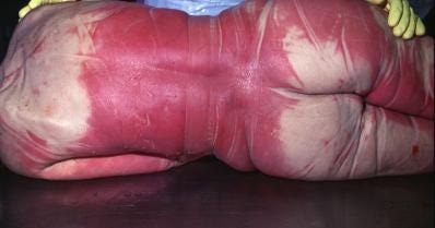 “Fig. 10.9.2: Bright red lividity on the dorsal side of the body as the expression of lethal carbon monoxide poisoning. Livor mortis is bright red in cases of carbon monoxide or hydrocyanide poisoning (or in cases where the corpse is kept in cold storage). Carbon monoxide is a colourless and odourless gas that arises, for example, from incomplete fuel combustion. Thus it is always necessary – primarily for self-protection – to consider or exclude carbon monoxide poisoning, particularly when bodies with bright red lividity are found in engine rooms, after engine room fires (automatic carbon dioxide fire extinguishing system!) or in boiler houses.”