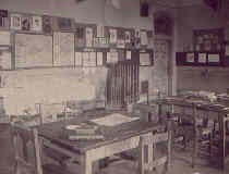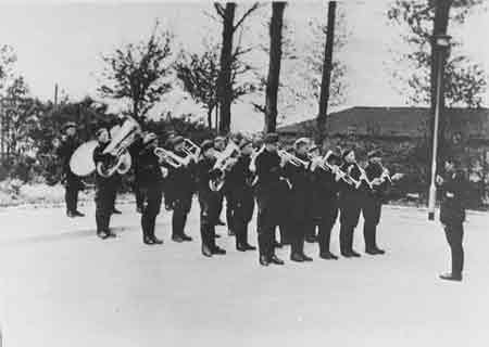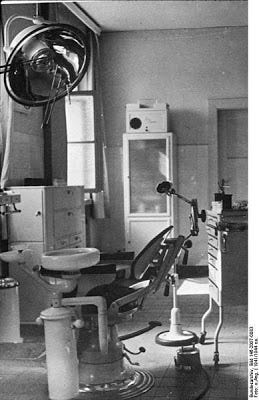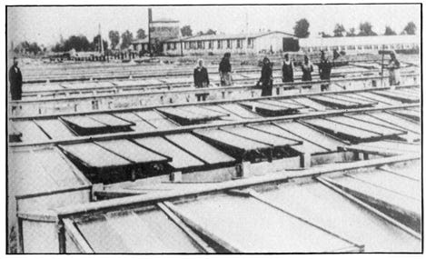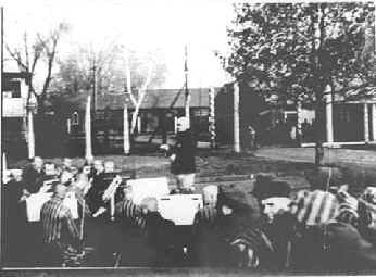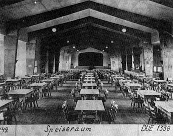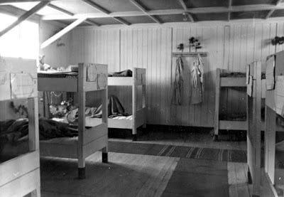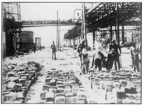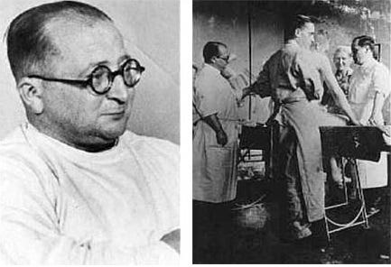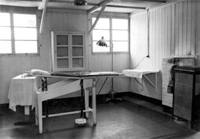 Below: A battery of three autoclaves, showing prisoners at work in the camp. The steam arrived through the light colored pipe above the autoclaves, and the dark pipe connected the pressure vessel to the hot water tanks. An electric motor enabled the steam to be rapidly evacuated at the end of the cycle (to the left of each autoclave). On the table a prisoner is filling in the operating report and there is a clock for timing the sterilization cycle. The two short rails in front of each autoclave are to receive the trolley carrying the effects to be disinfected. Note also the healthy condition of the camp inmates.