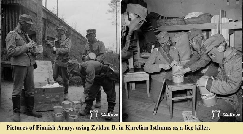The American army used Zyklon, once the typhus epidemics started to arrive around 1942. A 1921 report in the New York Times titled “New Delousing Plant” described how immigrants infected with typhus were treated on Hoffman’s Island, New York. Their clothing was gassed with cyanide gas using their equivalent of Zyklon, while the immigrants had their hair cut off and were put through showers; then their clothes were returned. It was the same process in the German camps.