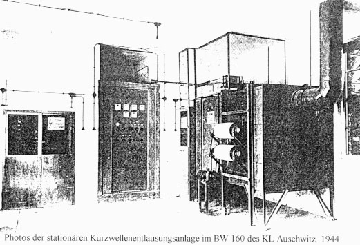 Microwave disinfestation technology was installed in the Auschwitz camp during the summer of 1944 and proved to be very effective. Germar Rudolf describes this as “the world’s first technological predecessor to the microwave ovens in common use today.” It was far more efficient and only took three minutes per sack of clothing.