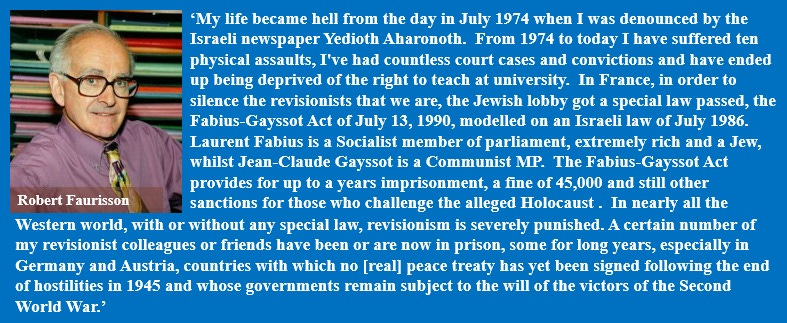 Vincent Reynouard, condemned for having the wrong view of history as it pertains to WWII and “Holocaust,” has now been refused a bank account. Is not the right to have a bank account a basic right of citizenship, necessary for carrying on one’s business in modern society … and not a privilege to be taken away for political reasons? This signals that questioning the “Holocaust” is intended to be utterly stamped out, not just discouraged. Also that the private sector is being forced to carry out the policies of the political governmental sector. And it also signals that Vincent Reynouard’s work in this field is effective, ie. successful, and as he is a younger man than Robert Faurisson and not likely to pass from the scene soon on his own — he must be stopped. Reynouard rightly speaks of a religous taboo, saying that “in our modern secularized societies, the Hitlerian “gas chamber” has become a religious taboo. He cites a columnist writing for L’Express: “Holocaust denial is not a hypothesis [to be debated]; Holocaust drew a line beyond which doubt is a crime.” Imagine that this is accepted in a supposedly Democratic society!