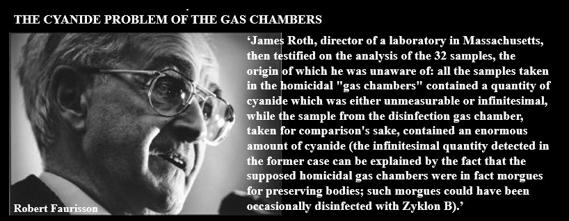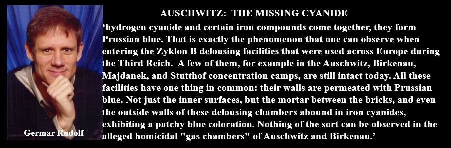 “Cyanide poisoning leaves a bright pink corpse and so does carbon-monoxide poisoning (allegedly, ‘one-third of the Holocaust’) and not one single pink corpse was ever recorded in the German labour-camps of WW2”