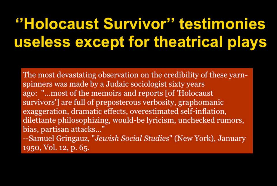 “The Holocaust is a deeply anchored belief even in people who know very little about it. We can see that not only does disbelief in the Holocaust myth threaten modern Jewish identity as shaped by political Zionism, but for others it brings into question the credibility of those in authority who told everyone it was true: the state, the churches, the schools, and media of every kind. These sources are the same ones people trust and depend on every day for information. If these trusted authorities are wrong about the Holocaust, what else are they wrong about? What other dishonesties are they promoting?”