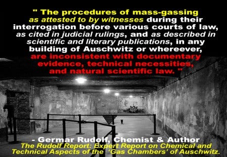 “Mass human cyanide gas chambers have never existed in human history.” The affirmation here is that normal hygiene technology functioned in an ordinary, normal manner in the German labour camps: that is the core essence of what is today meant by “Holocaust denial.”