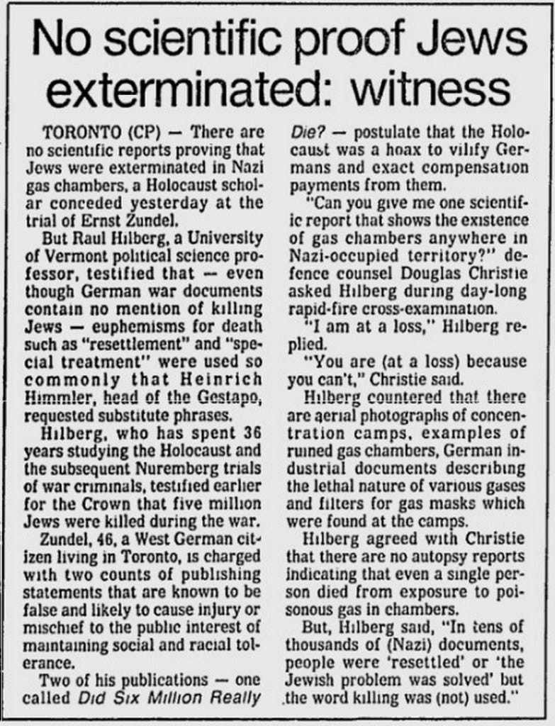 In Germany, if a person is taken to court on the charge of Holocaust Denial a truly Orwellian law exists that it is illegal to submit evidence to the court that refutes the alleged gas chambers or any other aspect of the Holocaust narrative. It is illegal for the defendant to defend their position. If the defendant attempts to defend their position in court the defendant will be found guilty of Holocaust Denial and further fines or years of imprisonment will be added to the defendant’s punishment for attempting to defend his or her position. If the defendant’s lawyer attempts to defend their client’s position the lawyer will also be charged and convicted of Holocaust Denial as happened to German lawyer Sylvia Stolz.