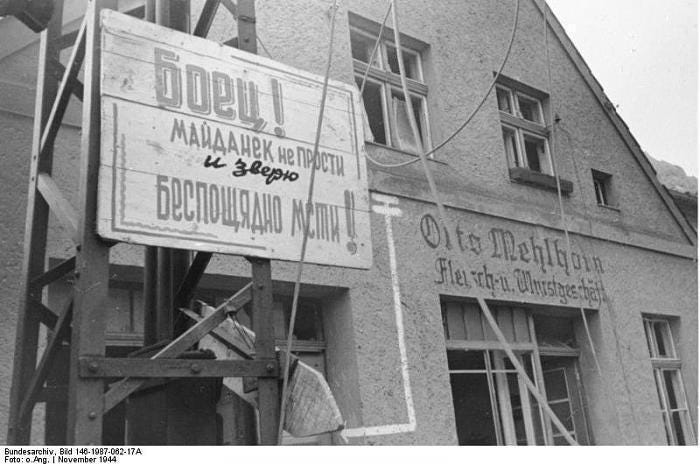 All settlements, in which German troops are found, up to a depth of 40 – 60km from the main lines of battle, are to be destroyed and set on fire, also 20-30km from the roads. For the destruction of the settled areas in the required radius, the air force will be made available, also artillery and rocket-launchers will be used extensively, as well as intelligence units, skiers and Partisan divisions, who are equipped with bottles with flammable liquid. These hunting expeditions in their activities of destruction are to be dressed to the greatest extent in German soldier’s uniforms and uniforms of the Waffen-SS looted from the German army.