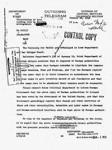 Surviving bills of lading for Zyklon-B, which are available for public inspection at the National Archives in the United States, show very clearly that Zyklon-B was shipped to all camps, and not just to the alleged gas chamber camps. The bills of lading in the US National Archives run from February16 to May 31, 1944, and reveal that the cases of cyanide crystals (Zyklon) are numbered in sequence (Nos. 50,053 to 50,210); each shipment consisted of thirteen cases, totaling 195 kg; and identical shipments—six each—went to Auschwitz and Oranienburg concentration camps. Oranienburg is situated in Germany, and not even the wildest Holocaust exaggeration has ever claimed that there was a homicidal gas chamber at that camp. The existence of proof of shipping of Zyklon-B to be used as a delousing agent to Oranienburg, is conclusive evidence of the real purpose for which that chemical was actually used in the camps.