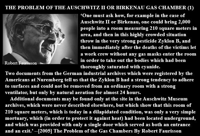 The concept people call “Holocaust-Denial” means an affirmation concerning the manner in which normal hygiene technology worked, namely the opposite of what was affirmed at Nuremberg in 1946 – by US/UK military “intelligence” – whereby merely producing a can of Zyklon was taken as evidence of mass human gassing. A remarkable act of amnesia was then accomplished over the hygiene technology which used this product – which later became defunct as DDT replaced it. The ethically damned “denier” is one who realizes that, in response to the arrival of typhus epidemics in the German labour camps in 1942, delousing technology was installed throughout all of the German labour camps, so that safe-to-use cyanide gassing technology killed bugs in all clothing and bedding put into them; and that it didn’t have any other use. No-one at Nuremberg discussed whether the Zyklon-B canisters were for delousing of mattresses or gassing Jews.