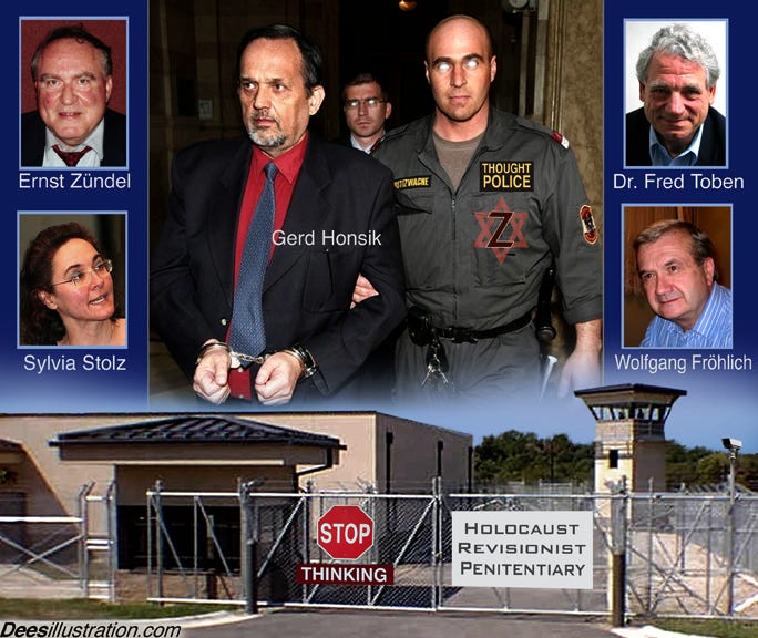 “If the Holocaust were unimportant, we wouldn’t have around 20 countries on this planet outlawing its critical investigation. In fact, this is the only historical topic that is regulated by penal law. This is proof for the fact that the powers that be consider this topic to be the most important issue to keep under their strict control. Those censoring, suppressing powers are the real criminals—not the historical dissidents they send to prison.”